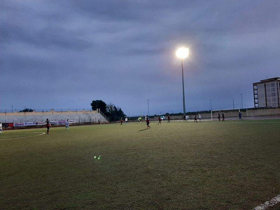 Nel primo tempo, dopo 5 minuti, i rossoblu passano subito in vantaggio grazie al gol realizzato dal bomber Ieva. I festeggiamenti, tuttavia, durano poco poiché gli ospiti al 18′ pareggiano i conti con Camassa sugli sviluppi di un corner. Sotto una pioggia battente le squadre rientrano negli spogliatoi sull’1-1.