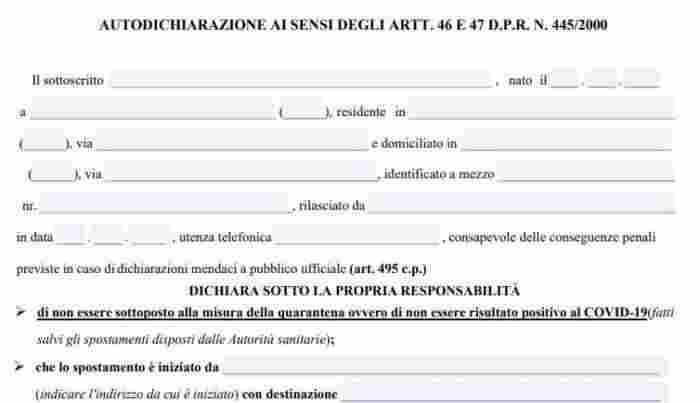 Sul nuovo modello si dovrà indicare l’indirizzo di partenza e quello di destinazione, oltre che a dichiarare di non essere sottoposti alla quarantena. Chi viola le norme rischia la sanzione amministrativa da 400 a 3 mila euro.