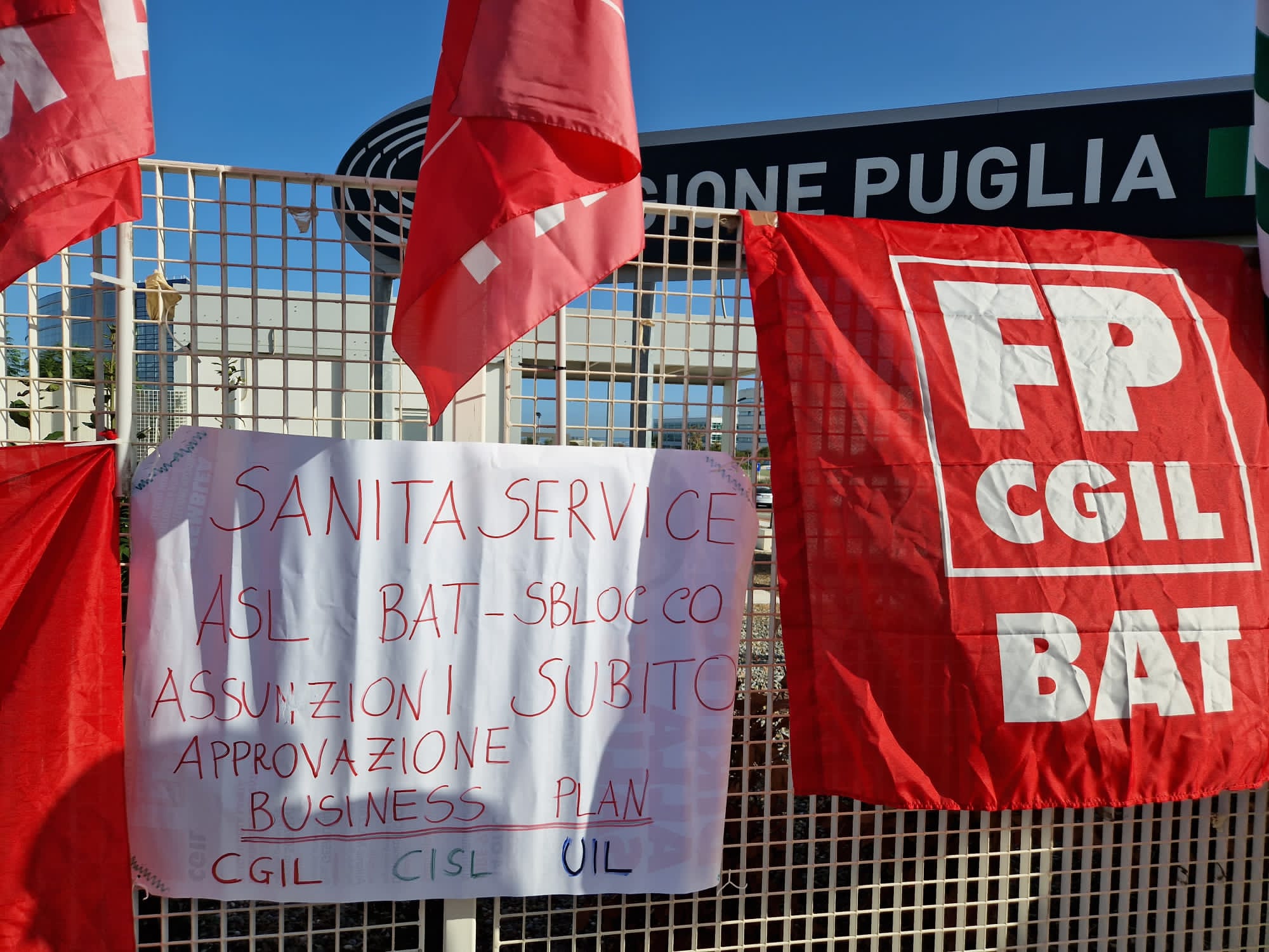 «I segretari territoriali delle categorie BARI- BAT- Puglia: Marzano e Remini per la FP CGIL, Stellacci per la CISL FP e Mennuni per la UIL FPL chiederanno a gran voce ancora una volta, con il sostegno dei lavoratori del settore, l’approvazione del Business Plan di Sanitaservice Asl Bt da parte della Regione Puglia con il contestuale sblocco alle assunzioni ed avvio delle procedure di reclutamento ad evidenza pubblica, utili a coprire gli organici carenti e garantire i servizi erogati dalla Sanitaservice ASL BAT alla cittadinanza. Auspicano altresì, di essere ricevuti dalla Direttrice Generale ASL BT e Amministratrice Unica di Sanitaservice nel corso del SIT IN di protesta, per rappresentare le ulteriori azioni di lotta che si renderanno necessarie, ivi compreso lo Sciopero, qualora non pervengono risposte alle legittime rivendicazioni sindacali da parte degli organi si governo sanitario della Regione Puglia».