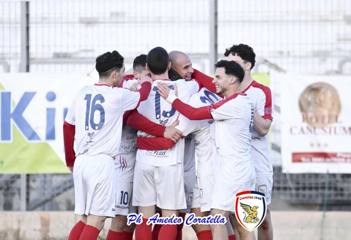 Si conferma pressochè perfetta, fra le mura amiche, il Canosa Calcio. Metabolizzata la sconfitta di Acquaviva, maturata ancora una volta a causa di sviste arbitrali, i rossoblù di Lanotte rifilano un sontuoso 3-0 al Bitonto confermando le proprie ambizioni play-off. A mettere in discesa il pomeriggio del “San Sabino” ci pensa Mangialardi al 19′ con un “gollonzo”. Nella seconda frazione, di assoluto controllo dei padroni di casa, è la pennellata del neo acquisto Edu Martinez, su calcio di punizione, a firmare il raddoppio. Nel finale, all’84’, ci pensa invece Talin direttamente da angolo con un gol olimpico, a mettere in ghiaccio la partita per il definitivo 3-0. Nota di merito per la retroguardia difensiva, che colleziona il decimo clean sheet stagionale, il nono per Tarolli.