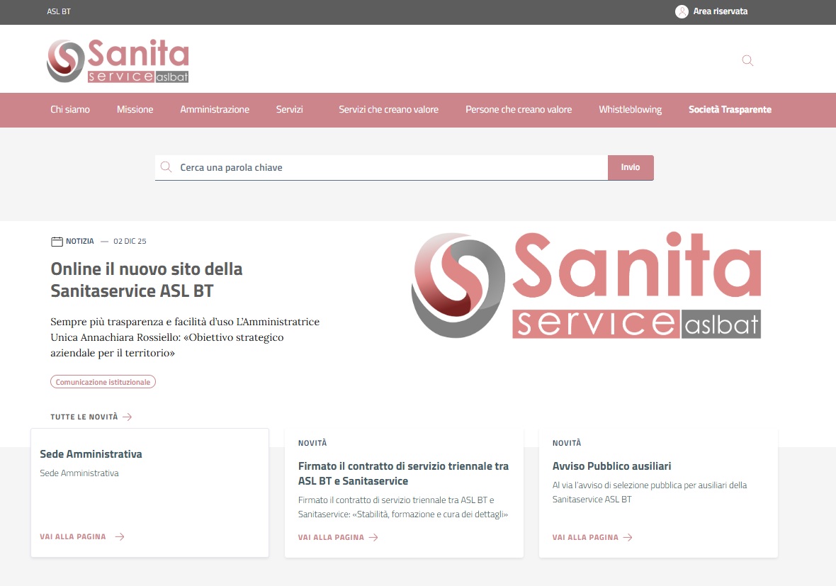 «Con questo imprescindibile convincimento, oggi la Sanitaservice si dota di uno strumento che permetterà di esser ancora più vicini agli oltre 600 dipendenti che svolgono i tanti servizi interni sanitari dell’ASL BT ma saremo soprattutto ancora più vicini al territorio e presenti ai cittadini, promuovendone la partecipazione e il controllo su funzioni e uso delle risorse pubbliche – chiude la dott.ssa Rossiello – Ancora più trasparenza grazie alla maggiore facilità di fruizione di tutte le informazioni che riguardano la vita aziendale. Implementate diverse sezioni, mentre ci sarà anche un ampio spazio dedicato alle news viste le moltissime attività che svolgiamo quotidianamente. Un prezioso riconoscimento a tutto il nostro fondamentale lavoro nella sanità pubblica sul territorio».