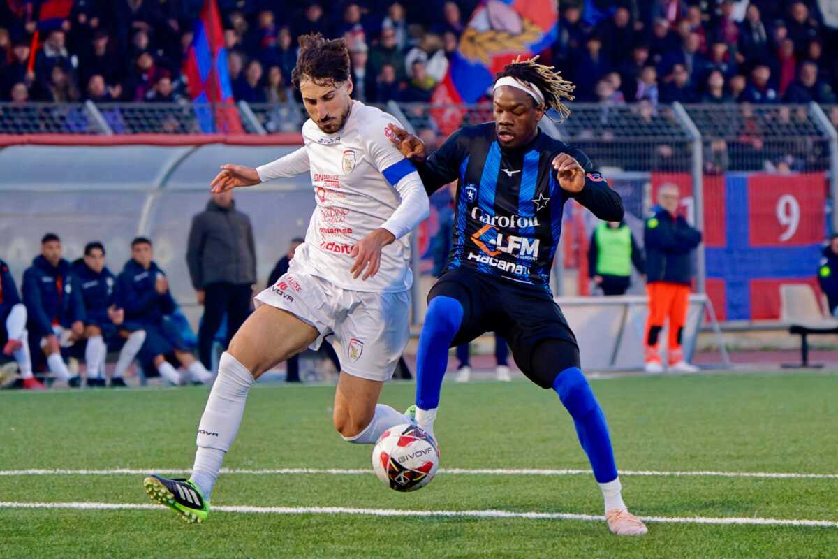 L’iniziale fase di studio è interrotta all’11’ dal velenoso destro a giro dal limite di Lopez disinnescato in tuffo da Massari, pochi istanti dopo Lavopa svetta in area, indirizzando oltre la traversa. Il match lo stappa invece il Canosa al minuto 18 con una perfida pennellata mancina dal vertice dell’area di Strambelli che sorprende Centonze infilandosi sotto l’incrocio di destra. Tre minuti più tardi Sene non riesce ad approfittare di un pasticcio difensivo dei padroni di casa e viene chiuso in angolo da Telera. Canosa insidioso al 24’: iniziativa in area di Strambelli per Croce, il cui tentativo è sventato quasi sulla linea dal capitano stellato Di Fulvio. L’intensità della gara aumenta e al 32’ Sene si ritrova davanti a Massari dopo lo scambio con Lopez, ma la mira è rivedibile. Passano un paio di minuti e ci prova Di Fulvio con un’inzuccata che esalta i riflessi di Massari, poi l’azione è interrotta dalla posizione di offside di Lopez che vanifica l’iniziale decisione dell’arbitro di concedere il rigore per un fallo proprio sul 9 nerazzurro. L’ultima chance prima della pausa è di marca rossoblu, con la rasoiata da oltre 20 metri di Iagulli respinta da Centonze.